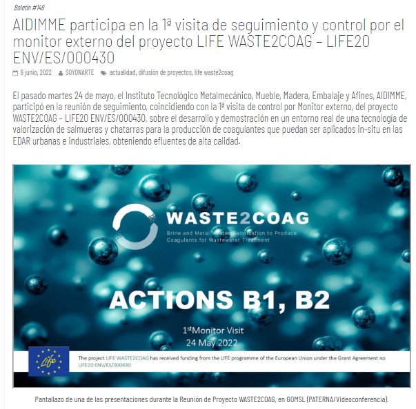 6th June 2022 NewsEl pasado 24 de mayo 2022, AIDIMME, participó en la reunión de seguimiento del proyecto LIFE Waste2Coag sobre el desarrollo y demostración en un entorno real de una tecnología de valorización de salmueras y chatarras para la producción de coagulantes que puedan ser aplicados in-situ en EDAR urbanas e industriales, obteniendo efluentes de alta calidad.