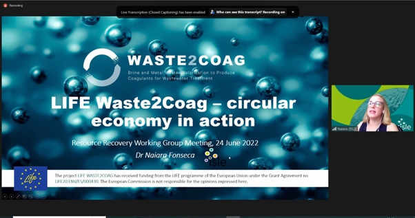 30th June 2022 NewsLIFE Waste2Coag attended the Water Europe Working Groups on Resource Recovery on 24th June 2022. Dr Naiara Fonseca presented at the event which was attended by 24 people.